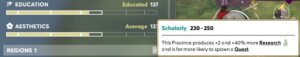 - Education: The more clever and sharp the Province is overall, the faster you will gain Research, enabling you to gain Technologies even faster! Beware, however, negative Education will lower your amount of Research from the Province. The smarter your Province is, the more they may ask you for favors, aka present you with Quests to complete as well.